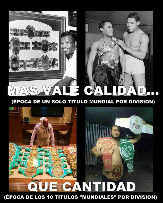 “Sí tú tienes un cinto de campeón del mundo es algo único, pero si tienes cinco, seis, siete y ocho y luego plata, internacionales y todos los cintos que tienes. Yo veo que se pierde el valor que debería de ser el único título, el mayor del mundo en toda esta maraña que ni sabemos los expertos de quienes son los campeones de todos los organismos de todas las categorías y subcategorías hacen títulos interinos...Antes era difícil por eso porque había un cinto. Si hay mucha gente corriendo por un solo cinto es difícil, pero si hay cinco cintos es cinco veces más fácil llegar a uno de ellos”.