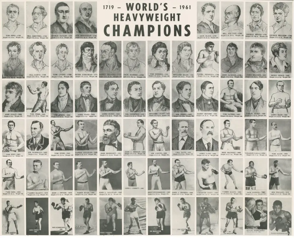"Si te preguntas qué es un campeón lineal, en realidad es bastante simple. A modo de ejemplo, comencemos desde el comienzo de la división de los pesos pesados. Es 1892, las reglas de Queensbury están ganando aceptación y John L Sullivan es el campeón a puño limpio. ¿Por qué? Porque venció a todos. El retador más digno para él es James J Corbett. ¿Por qué? Porque también ha vencido a todos. La pelea se disputa con guantes y - ¡listo! - tenemos la primera pelea de la era de los guantes por el campeonato mundial de peso pesado. Corbett boxea brillantemente y gana. Él es el primer campeón”.